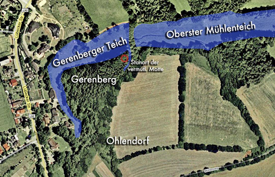 Die Entwicklung des ersten Bliestorf ist wohl eng mit der Anlage der Brömbsenmühle, 1380 noch Wyndelborn Mühle genannt, verbunden. Von den Stauteichen dieser Mühle sind heute noch erhalten der Untere, Mittlere und der Heideteich. An den Mittleren Teich schlossen sich den Kastorfer Mühlenbach stromaufwärts folgend noch der Obere Teich und der Gerenberger Teich an. Das Gelände des ehemaligen Gerenbergsteich ist nun genau von der Flur Ohlendorf umschlossen, so dass das ehemalige Dorf sich um diesen Teich gruppiert haben muß. Dafür spricht auch der Verlauf der Lübecker Straße, der diesen Bereich zusammen mit dem Mühlenweg in einem weiten Bogen begrenzt. Auf dem im Zentrum befindlichen, strategisch günstig gelegenen Gerenberg läßt sich der Standort einer mittelalterlichen Motte vermuten. Motten sind Turmhügelburgen, die meist von Wasser (natürliche Gewässer oder Gräben) umgeben waren. So findet sich auch in Bliestorf die für das Mittelalter typische Trennung von Schutzburg und Wohnhof.