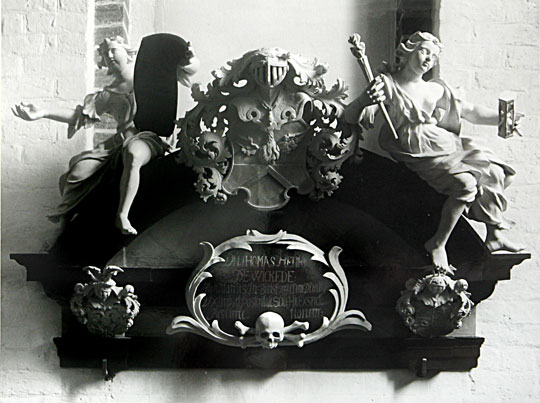 Gruftportalbekrönung in der Krummesser Kirche von Thomas Hinrich von Wickede, * 1659, † 1734.