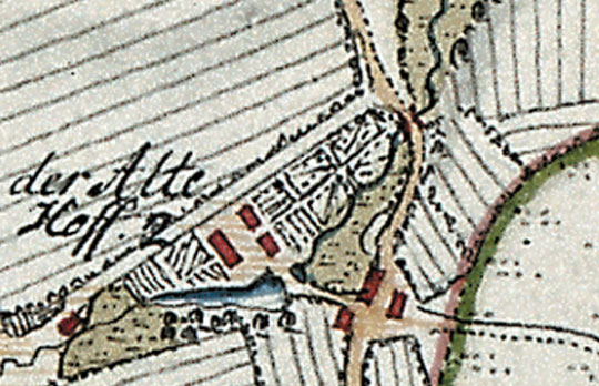 Der "Alte Hof" auf der Karte von 1776, hier mit 2 Feuerstellen angegeben. Der untere Teich hinter der Schmiede ist schon abgelassen.