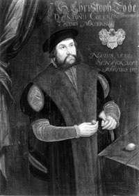 | ![]() | Bildnis des Lübecker Bürgermeisters Christoph Tode * 1512, 1579 † Zum Bild: in der Hand hält er einen sogenannten Bisamapfel , ein an einer Kette zu tragendes, mit erlesenen Düften angefülltes Schmuckstück. Die neben ihm auf dem Tisch liegende Zitrone galt als Zeichen der Trauer, daher ist die Entstehung des Bildes wahrscheinlich in das Todesjahr seiner Frau 1556 zu datieren. Ein weiteres Bild befindet sich im Museum fur Kunst und Kulturgeschichte. und daneben seine Petschaft |