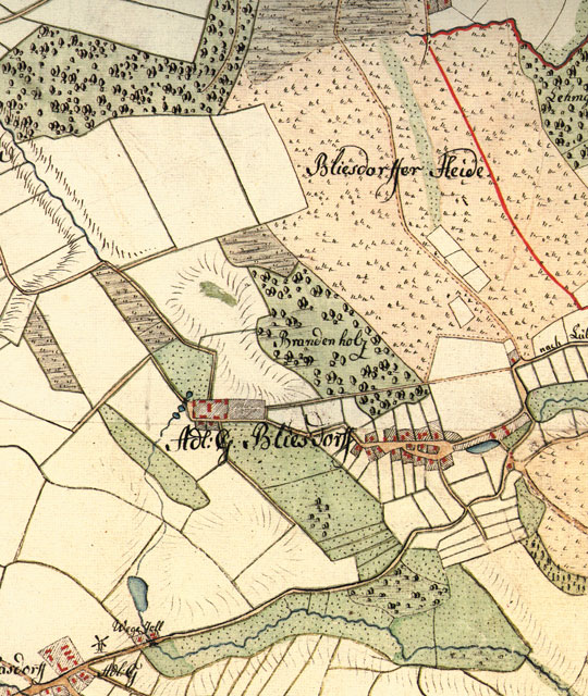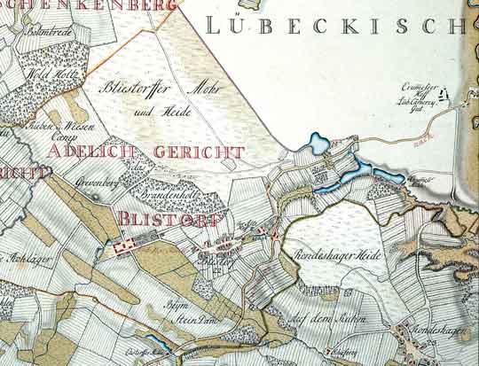 Ausschnitt aus der Kurhannoverschen Landesaufnahme von 1776 (allerdings ist hier fälschlicherweise der ganze Heideteich Bliestorf zugeordnet)