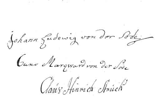 | Johann Ludwig von der Sode, * Hannover 20.08.1695, † Hof-Bliestorf 22.07.1769, Erbherr auf Badekaw, Sohn des Johann Hermann von der Sode, Hofgerichtsassessor und Bürgermeister von Hannover und der Anna Sophia von Mannsberg. Britisch-Hannoveranischer Obrist, Lieutenant im Bülowschen Dragoner Regiment, Beckendorf, wird 1744 als Oberstlieutnant verabschiedet. 1. ∞ Vellahn/Meckl. 11.07.1720 Christine Wilhelmine Barbara von Pentz, * Brahlsdorf 08.11.1697, † 12.12.1730, V: Cuno Marquard von Pentz, Herr auf Brahlsdorf und Abel Maria von Pentz aus dem Hause Raguth. 2. ∞ Gresse 21.02.1738 Magdalena Juliane Wwe. von Wickede, geb. von der Knesebeck aus dem Hause Gresse, * Gresse 18.04.1688, † 02.09.1749, sie 1.∞ mit Thomas Hinrich von Wickede, Erbherr auf Bliestorf († 1734) Kinder: Aus der ersten Ehe gingen 4 Töchter und 3 Söhne hervor, darunter Cuno Marquard * Gresse 19.12.1728 weiter s.u. Dorothea Juliana Eleonora ∞ Krummesse 25.04.1744 Georg Thomas von Wetken, Erbherr auf Schenkenberg, Anna Sophia † Bliestorf 1763 Agnesa Elisabeth ∞ Krummesse 1754 Otto Marquard von Pentz, Lieutnant Abel Maria ∞ Krummesse 1756 August Heinrich von Sprengel, Hauptmann |